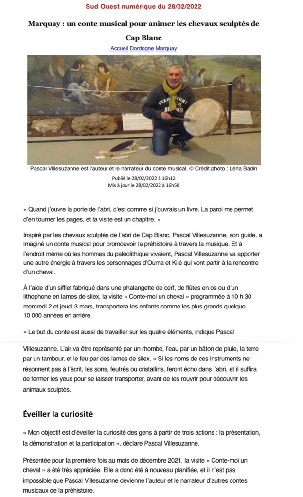 Article Sud Ouest du 28/02/2022, Marquay, un conte musical pour animer les chevaux sculptés de Cap Blanc. Pour voir l’article, cliquez sur le lien ci-dessous ⬇️