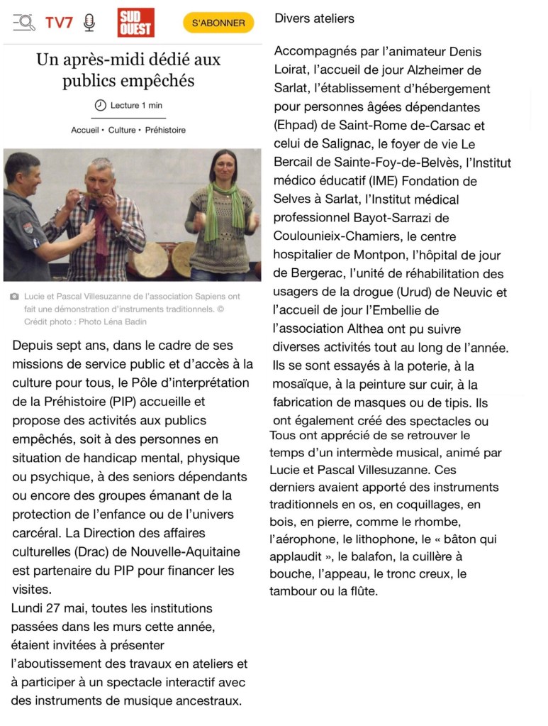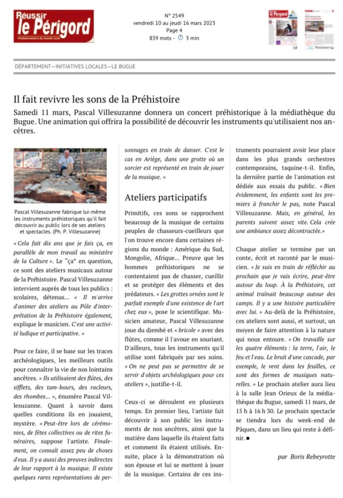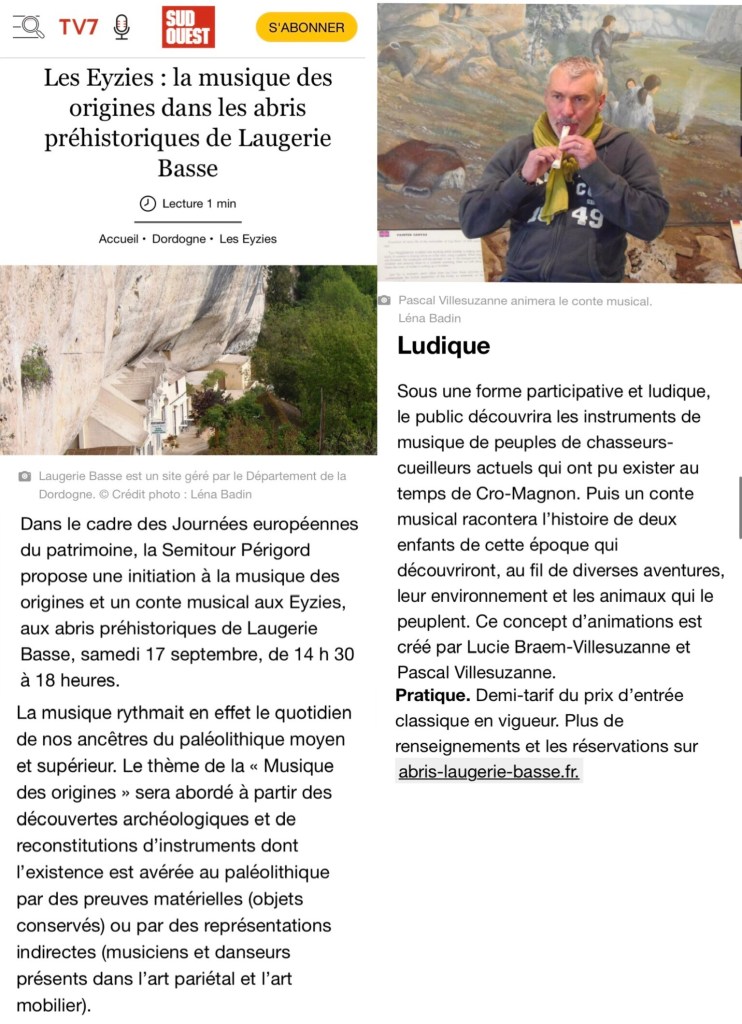 Article Sud Ouest du 13/09/2022, La musique des origines dans les abris préhistorique de Laugerie Basse. Pour voir l’article, cliquez sur le lien ci-dessous ⬇️